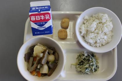 今日の献立は、麦ごはん・筑前煮・はりはり漬け・月見団子・牛乳です。ごちそうさまでした。(^^)/