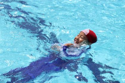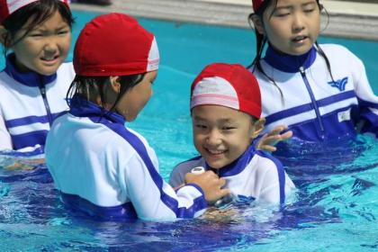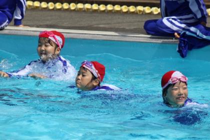 写真上:顔をあ上げ、平泳ぎで。泳げないよう。