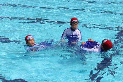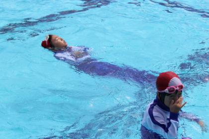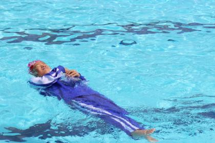 下:ペットボトルを服の中に入れると、もっと浮きやすく、泳ぎやすくなるよ。