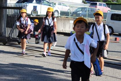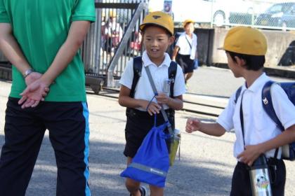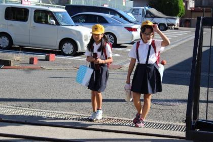下:タオルを首に引っかけての登校。暑くなりそうだもんね。