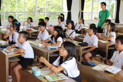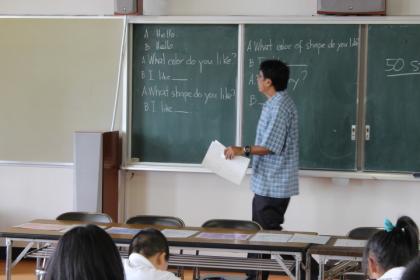 視聴覚室で、ラモン先生がリードしての英語の学習をしていました。「どんな色が好きですか?」等、英語で質問され、好きな色を英語で答える学習をしていました。みんな、活発に物怖じせず、ハキハキと答えていました。