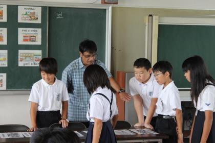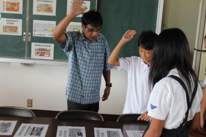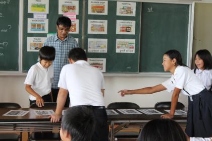 予め、ラモン先生が10数枚のカード(絵と単語が描かれている)を並べておきます。二手に分かれて、両サイドから順々に答えて行き、出会ったところで2人がジャンケンをし、負けると退き、勝つと進む。負けた方は次の人が端からスタートし、出会ったところでジャンケンしていくもので、片方が相手のところまで進めば、勝ちになるというルールのゲームをしていました。楽しみながら、英語を学べるので、みんな生き生き楽しそうでした。