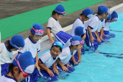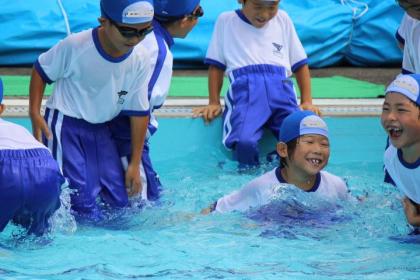 待ちに待った1年生の着衣水泳。最初は少し怖かったけど、水につかっていると楽しくなったよ。だけど、これでは泳げないよ。プールから上がる時も重くて大変だったよ。