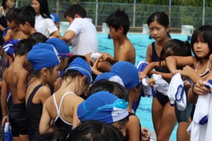 6年生も今日、着衣水泳を行いました。プールに入る前、前の時間に着衣水泳をしてずぶ濡れになった1年生児童の体操服の上下を6年生が絞ってあげていました。とても、ほほえましくもあり、たくましさも伺えた場面でした。