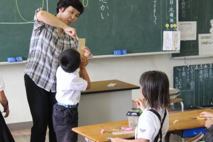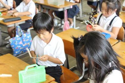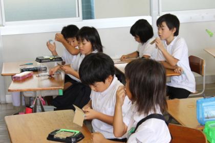 段ボールを適当な大きさの長方形に切り、二つ折りにして、輪ゴムを絡ませ、離すとピョンピョン跳ねるんだよね。