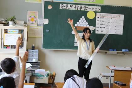 栄養教諭を目指す木香さんは、特に学校給食に興味があり、栄養のバランスを考えた、よりおいしく、より楽しく食べられる給食を創造していきたいとの夢をもち、教育実習に臨まれました。3年生の2クラスを対象に「発見!!行事食のヒミツ」の単元授業を行いました。