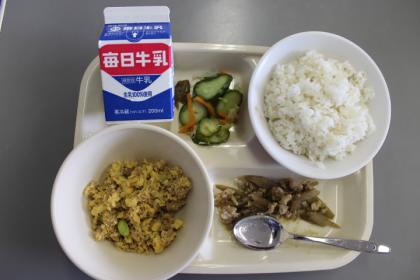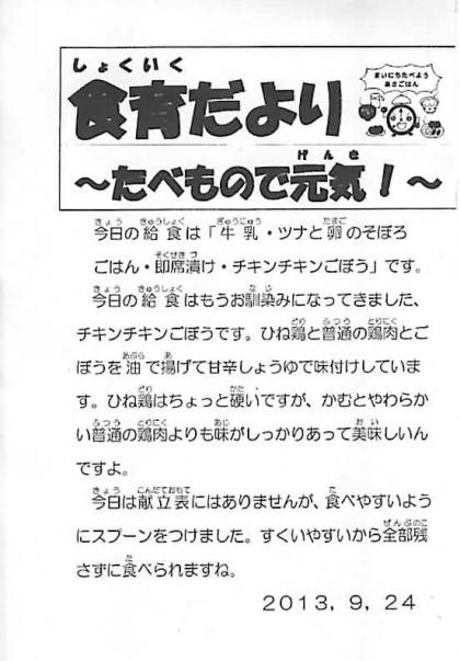 今日の献立は、ツナと卵のそぼろごはん・即席漬け・チキンチキンごぼう・牛乳です。ごちそうさまでした。(^^)/