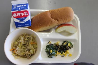 今日の献立は、黒糖パン・野菜炒め・海藻サラダ・リンゴ・牛乳です。ごちそうさまでした。(^^)/