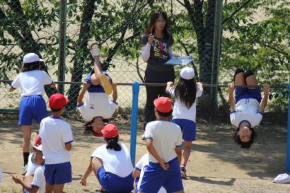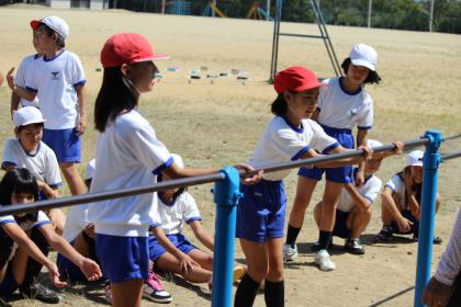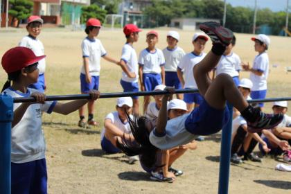 運動場の南の端に鉄棒があります。5年生が体育で鉄棒をしていました。低学年の時は難なくできていた逆上がりができなくなっている子。
