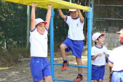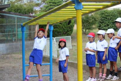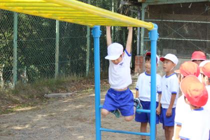 今日の体育の時間は、3クラス合同でした。雲梯、鉄棒、のぼり棒、タイヤとびなどが、どれくらいできるかやってみました。できなかった子は、さっそく休憩時間に練習していたようです。