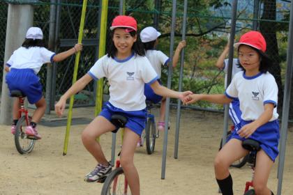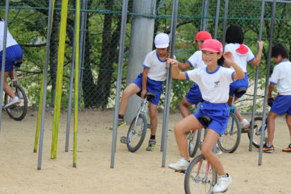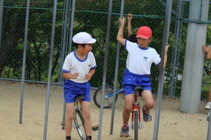 4年生が体育をしていました。鉄棒の特訓と一輪車に乗る練習をしていました。