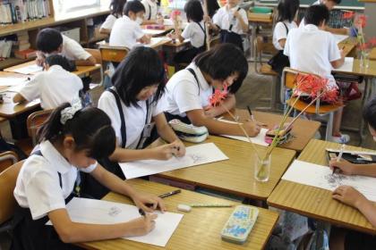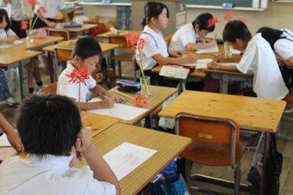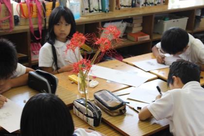 この季節になると、田んぼの周りや土手などに一気に咲くヒガンバナ。図工の時間に4年A組がヒガンバナのスケッチを描いていました。複雑で繊細な形をしているヒガンバナをしっかりと観察していました。
