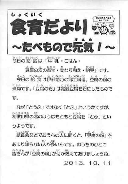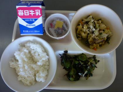 今日の献立は、ごはん・豆腐の粉(とふのこ)の煮物・変わり和え・納豆・牛乳です。ごちそうさまでした(*^_^*)