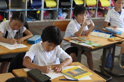 写真上:思い出に残った場面の絵も描こう!