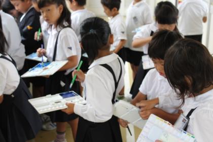 下:パレットと筆を洗います。順番待ち〜!