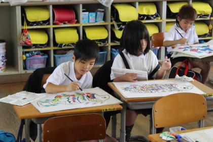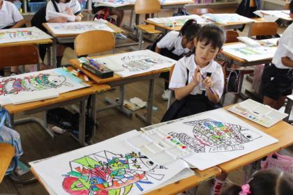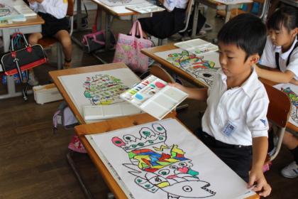 1年生の教室では、不思議な魚の絵が描かれているところでした。色を塗るごとに、その子の想像する魚の絵が出来上がっていきます。想像力豊かなところに感心しました。