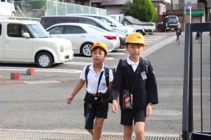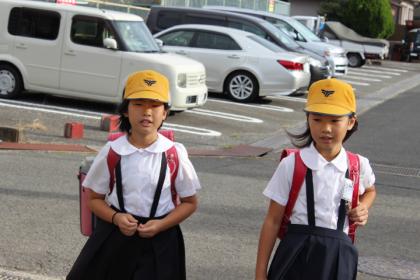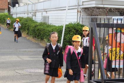 写真上:いつも二人仲良く登校。「おはようございます」。