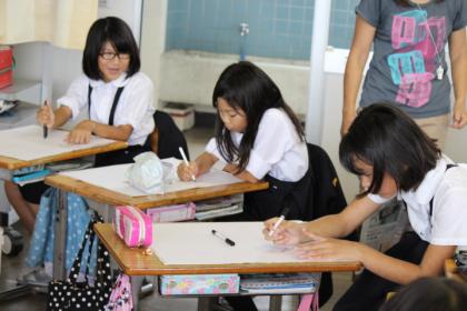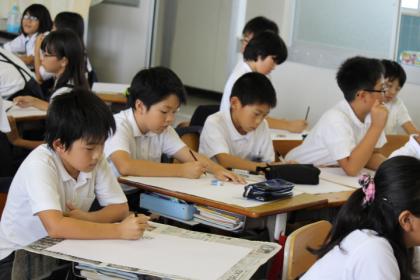 5年生の教室では、アコーディオンを弾く友だちをモデルにして絵を描いていました。大きく描いて、生き生きとした友だちの姿を表現していました。