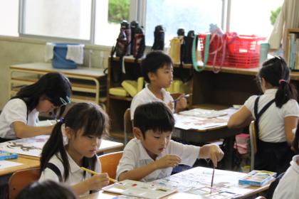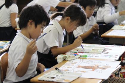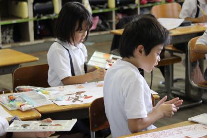 「ぶんぶくちゃがま」のお話を元に、お気に入りのシーンを絵で表現しているところです。たぬきの変装をコミカルに、リアルに、オリジナルに それぞれがうまく表現していました。