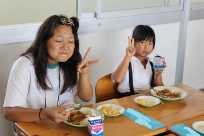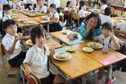 中:給食の時間。もうすっかりなじんでいます。