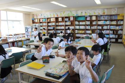 写真上:毎週一回しかない図書の時間。たくさん本を読みましょう。