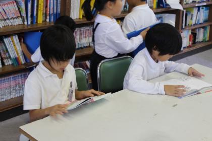 図書室を覗くと、かわいい1年生が本を読んだり、借りたりしていました。小さい頃から読書習慣をつけておくと、大きくなっても本を読むことが楽しみになるよね。