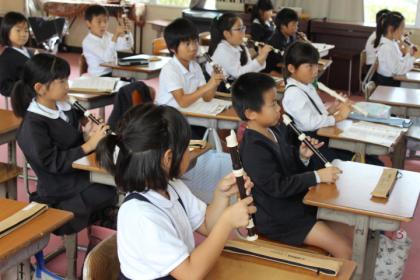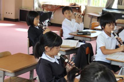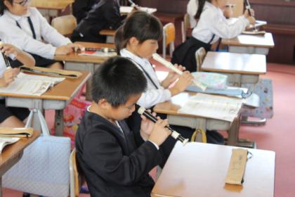今日は、リコーダーのミの音の出し方を学んでいました。きれいな音を出すには、姿勢や指の押さえ方が大事なようです。みんなの好きな「山ねこバンガロー」を演奏できるよう、奮闘していました!!