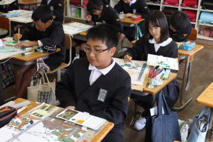 5年生は色塗りをはじめ、もうすぐ完成する子もいました。テーマは「電信柱のある風景」とのことでした。色使いが上手な子が多く、できあがりが楽しみ。