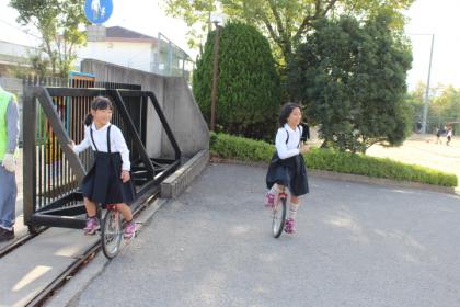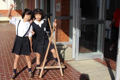 写真上:授業中に練習している三角竹馬、二人で練習するのね。