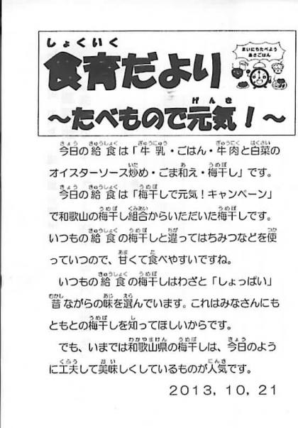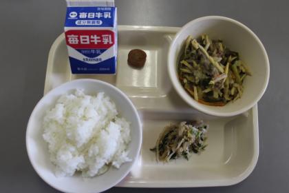 今日の献立は、ごはん、牛乳、ぎゅうにくとはくさいのオイスターソースいため、ごまあえ、うめぼし でした。 ごちそうさまでした。