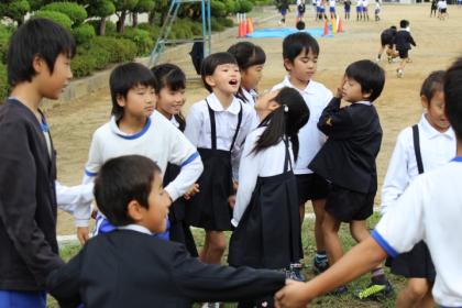 写真上:いろんな学年の子と一緒に、はないちもんめ。