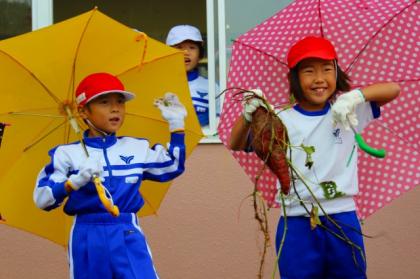 写真上:やったー!大きなおいもだ\(^o^)/力を合わせて頑張りました。