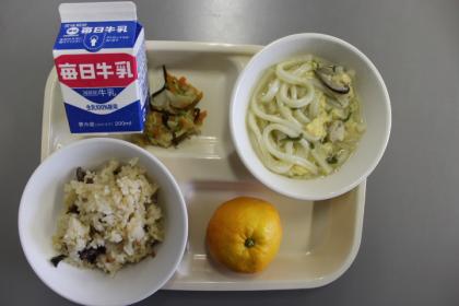 今日の献立は、牛乳・きのこごはん・かやくうどん・昆布和え・果物です。ごちそうさまでした(*^_^*)
