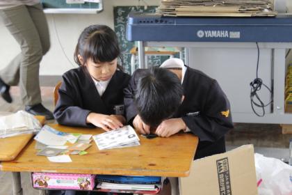 写真上:協力しておみやげ作り。