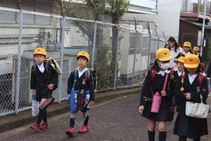 写真上:月曜の朝の登校。どんなお話をしながら登校してくるのかな?