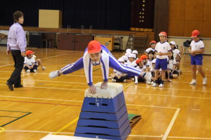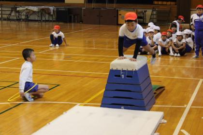 体育の時間に、とび箱をしました。まずは、五段から跳ぶ練習をしました。