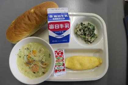 今日の献立は、牛乳・減量オレンジパン・スープスパゲティ・オムレツ・大根ツナサラダです。ごちそうさまでした(*^_^*)
