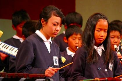 中:みんな真剣な表情で、指揮にあわせて合奏しています。