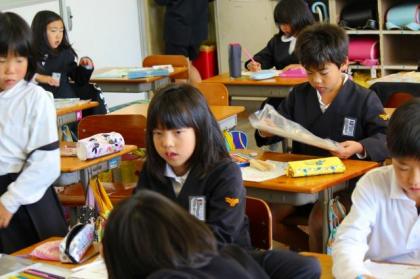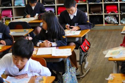 図工の時間に『くぎ打ちとんとん』。板に絵を描いた後、金槌を使って釘を打っていく教材(コリントゲーム)で、今日は板に絵を描きました。