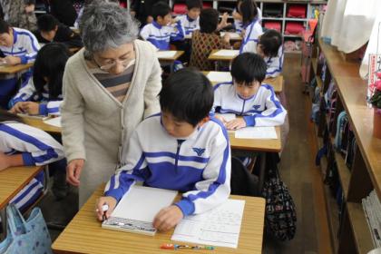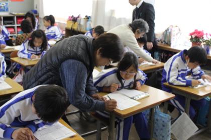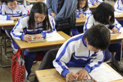 今日はその実践!!3時間目に4Aが、4時間目に4Bが、点字サークル『てんとう虫』の皆さんに点字の打ち方などを教えていただきました。(写真は4Bの様子です。)