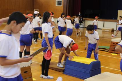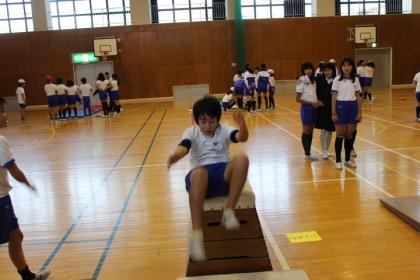 体育館をいっぱいに使って、A組とB組が一緒に体育をしていました。各コーナーでのミッションをこなしていっていました。各班制限時間は5分です。マット、跳び箱を配置し、色々な跳び方に挑戦していました。さて、全部クリアできた子はいたのかな?