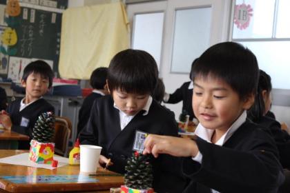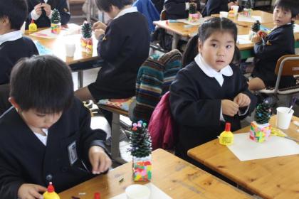 ジャンボまつぼっくりを使って、クリスマスツリーを作っています。鉢カバーになるところは、牛乳パックに色紙を貼りました。カラフルできれいですね。ツリーの完成が楽しみです。
