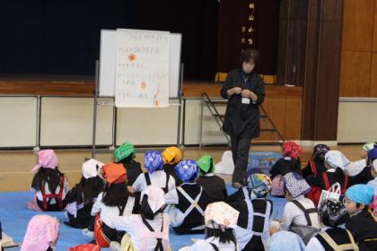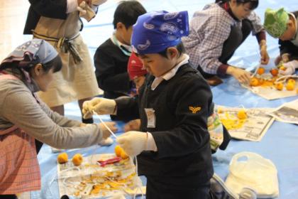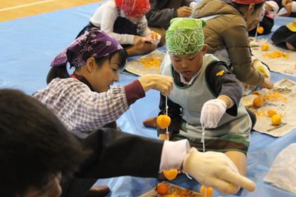 体験を通じて学びを深めるため、体育館で「つるし柿作り体験」をしました。