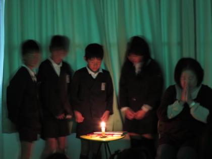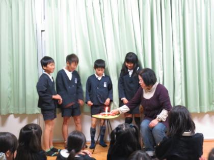 写真上:ろうそくの炎を消す人は特別な人。今月が誕生日の4人だね。