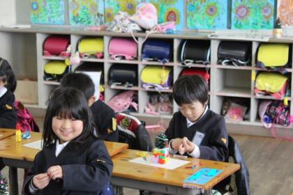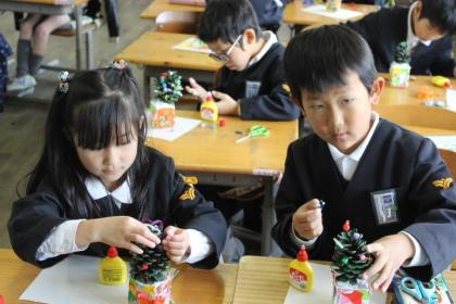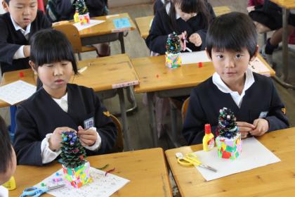 冬休みになると、すぐあるのがクリスマス。1年生はいち早くクリスマスツリーができあがりました。世界で一つしかないツリー。おうちで飾ってもらおうね。