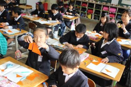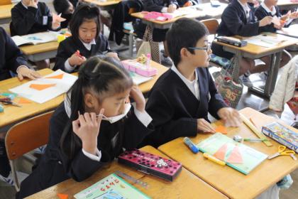 2年生B組の方では、色紙を切って三角形と四角形を作っていました。切ってできた三角形と四角形をノートに貼っていました。