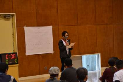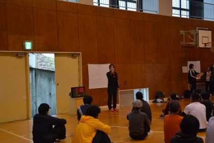 保健体育部長さんさんと学校長からのあいさつに続き、部員さんによるルール説明があり、準備体操をして、いよいよ試合開始です。