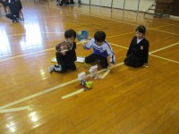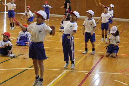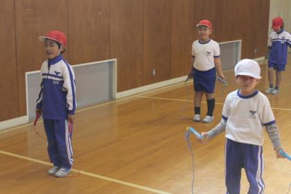 体育館で、にぎやかな足音が響いていました。のぞいてみると、1年生がなわとびをしているところでした。