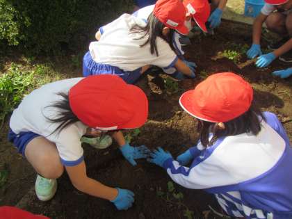 今日やっと、収穫の日がやってきました。そうっとそうっと掘っていきました。サツマイモの頭が見えてきたときの子どもたちは、