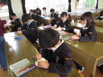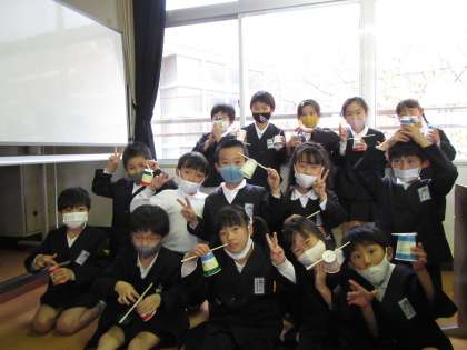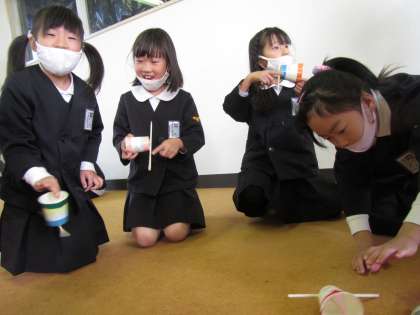 出来上がったら、割りばしをくるくる巻いて、手を離すと紙コップがくるくる回ります。